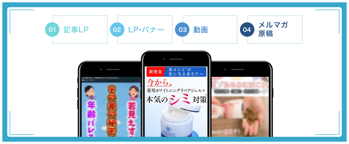静止画バナー、動画、記事LP、商品LP、メール原稿といったあらゆる制作物を、戦略的に設計します。例えば、「このターゲットには、この訴求軸の動画広告が最も響く」「このLPは、この構成にすれば離脱率が下がる」といった仮説を立て、それを検証する形で制作を進行。公開後も細かい要素をテストし、ファクトベースでの改善を繰り返すことで、クリエイティブの効果を最大化していきます。